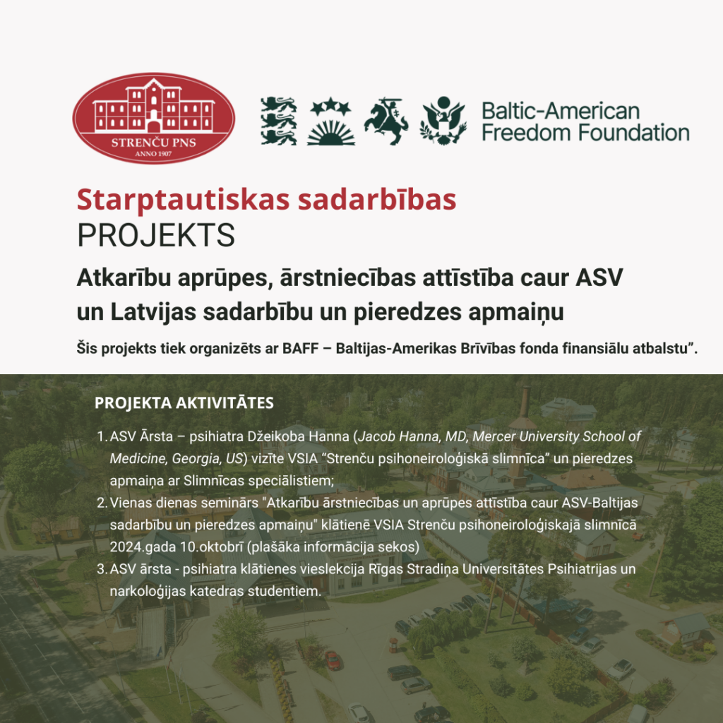 VSIA Strenču psihoneiroloģiskā slimnīca (arī – Slimnīca) ir uzsākusi starptautisku sadarbības projektu ”Atkarību aprūpes, ārstniecības attīstība caur ASV-Latvijas sadarbību un pieredzes apmaiņu”, kura ietvaros nedēļu garā vizītē Latvijā ieradīsies ASV ārsts – eksperts Dr. Džeikobs Hanna (Jacob Hanna, MD), sertificēts psihiatrs ar daudzveidīgu pieredzi atkarību ārstēšanā. ASV ārsta vizīte Latvijā norisināsies no 6.-12.oktobrim. Projektā afiliētā sadarbība norisinās ar Mercer Universitātes Medicīnas skolu, Džordžijas štatā, ASV.