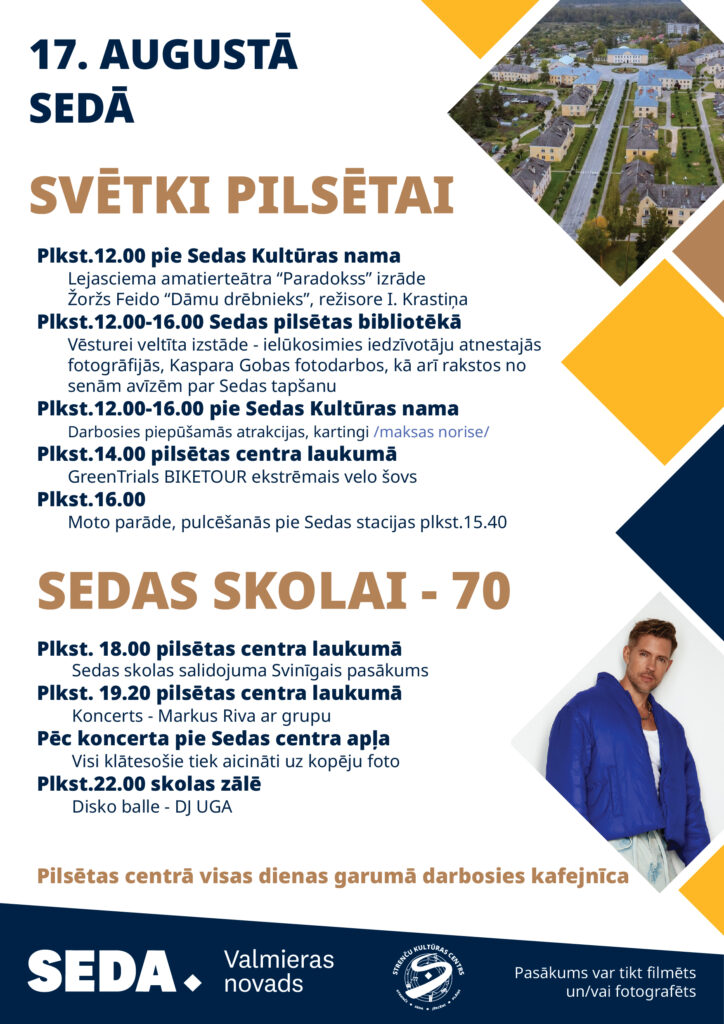 Sestdien, 17. augustā, svētku noskaņa valdīs Sedā, atzīmējot septiņdesmitgadi, jo Sedas pirmsākumi datēti ar 1954. gadu, kad te izveidots strādnieku ciemats un kūdras fabrika “Seda”, uzbūvēta, skola un citas ēkas. Tiesa gan Seda ir viena no jaunākajām pilsētām, jo pilsētas tiesības ieguvusi tikai 1991. gadā, tādējādi šogad svinama pilsētas 33. dzimšanas diena.