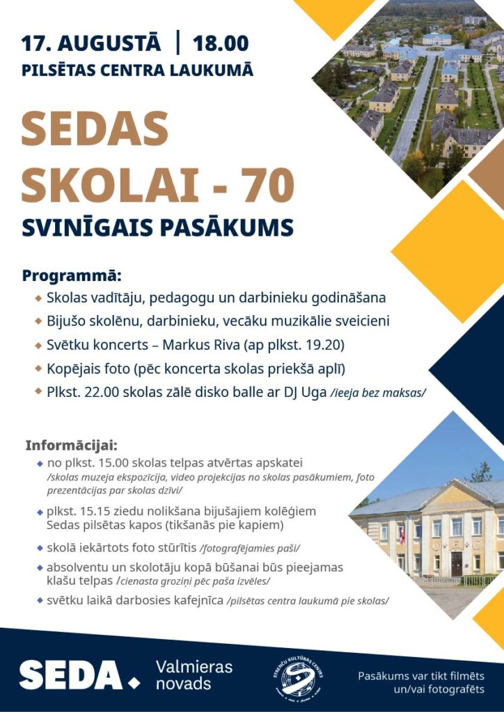 Kad norims moto troksnis, sāksies dienas centrālais notikums – Sedas skolas 70. jubilejas svinīgais pasākums – skolas vadītāju, pedagogu un darbinieku godināšana, bijušo skolēnu, darbinieku, vecāku muzikālie sveicieni. Ap plkst. 19.20 visus klātesošos ar svētku koncertu iepriecinās latviešu mūziķis Markus Riva. Pēc koncerta pie skolas visi aicināti uz kopīgu fotografēšanos, bet plkst.22.00 skolas zālē sāksies disko balle Dj UGA vadībā.