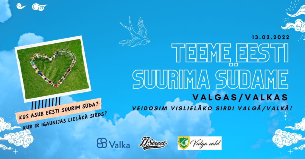 Arī Valgas pašvaldība plāno piedalīties šajā akcijā ar sirsnīgajiem Valgas un Valkas pilsētas iedzīvotājiem. Tas nozīmē, ka gaidām jūs visus šo svētdien uz Dvīņu pilsētas robežas, lai kopā ar visiem dalībniekiem izveidotu lielu sirds formu un iemūžinātu to ar dronu.
