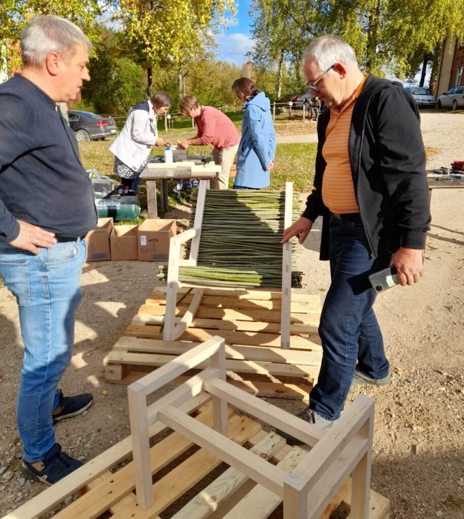 Viesojoties Gatartas pansionātā, variņieši tiek iesaistīti arī šīs iestādes aktivitātēs. Attēlā – Zigmāram jaunumus, arī eksperimentālo krēslu projektu, izrāda pansionāta vadītājs Aivars Damroze (no kreisās). Foto: No personīgā arhīva