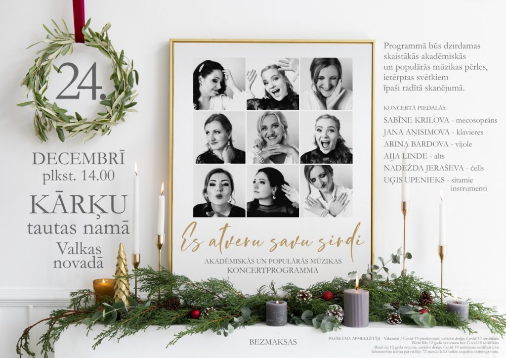Piektdien, 24. decembrī pulksten 14.00 Kārķu tautas namā ikvienu priecēs Ziemassvētku koncerts “Es atveru savu sirdi”. Programmā būs dzirdamas skaistākās akadēmiskās un populārās mūzikas pērles, ietērptas svētkiem īpaši radītā skanējumā. Koncertā piedalīsies Sabīne Krilova – mecosoprāns, Jana Aņisimova – klavieres