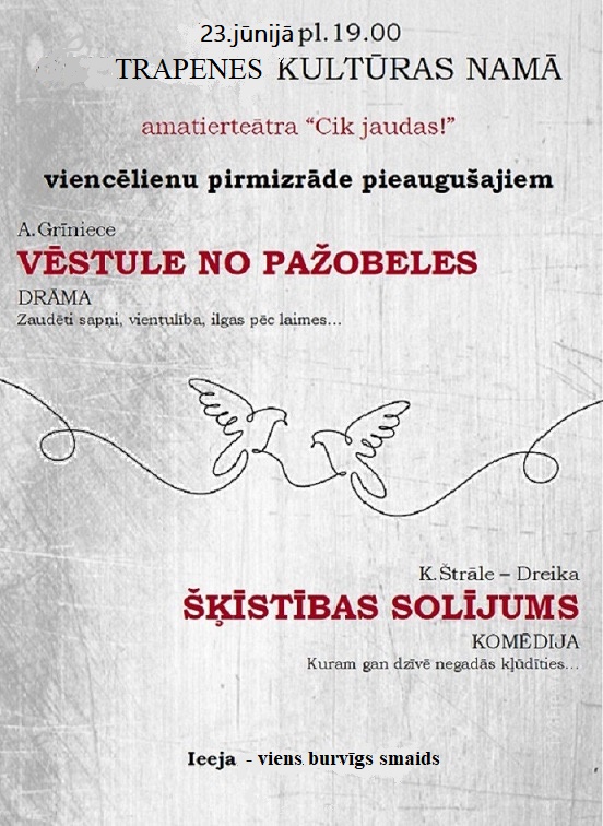 23.jūnijā plkst. 19.00 Trapenes kultūras namā amatierteātra “Cik jaudas” viencēlienu izrāde pieaugušajiem A. Grīnieces drāma par zaudētiem sapņiem, vientulību, ilgām pēc laimes “Vēstule no pažobeles” un K.Štrāles-Dreikas komēdija “Šķīstības solījums”, par to kā dzīvē mēdz gadīties.