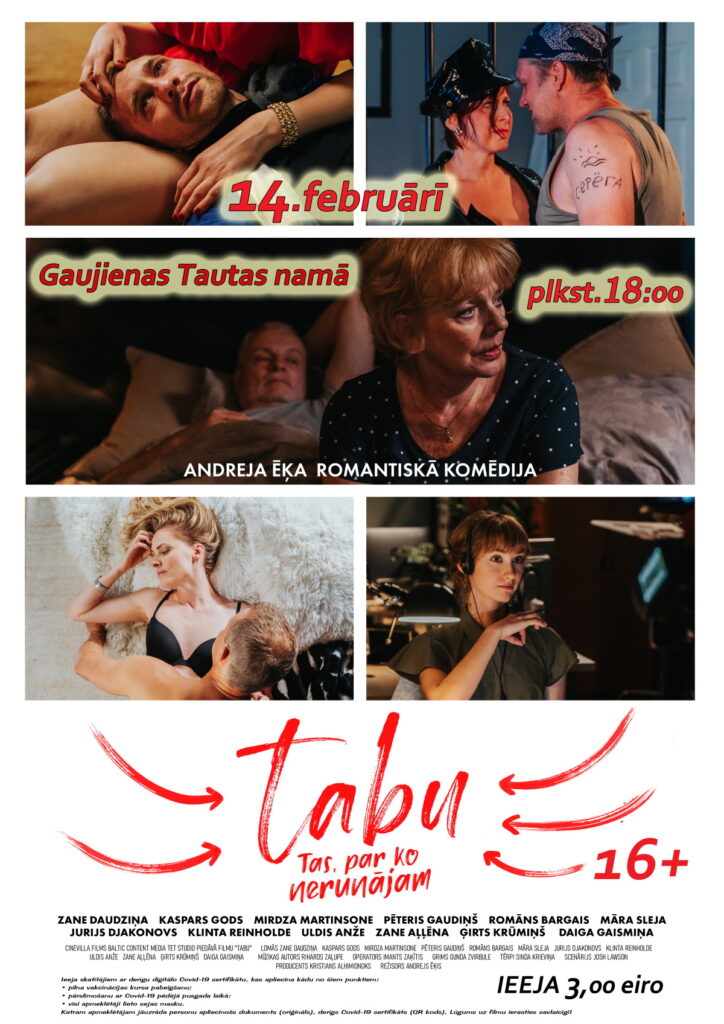 14.februārī plkst.18:00 Gaujienas tautas  namā tiks demonstrēta Valentīna dienai piemērotā Andreja Ēķa romantiski pikanta komēdija “TABU”. Biļetes cena – 3,00 EUR.