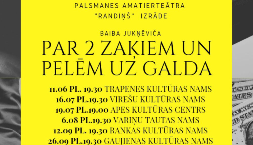 19. jūlijā pulksten 19.00 Palsmanes amatierteātris „Randiņš” ar Baibas Jukņēvičas izrādi „Par 2 zaķiem un pelēm uz galda”. Ieejas maksa – 5 eiro, senioriem 3 eiro.