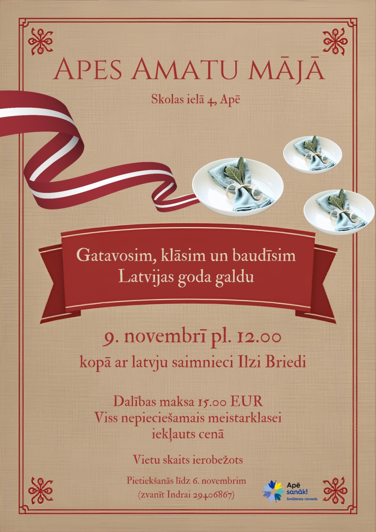 9.novembrī gatavosim, klāsim un baudīsim Latvijas goda galdu kopā ar latvju saimnieci Ilze Briede.