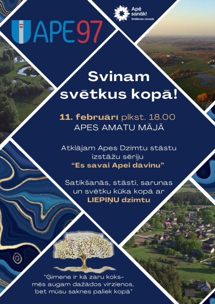 11.februārī plkst. 18.00 Apes Amatu mājā norisināsies īpašs pasākums par godu Apes 97. jubilejai. Šajā vakarā tiks atklāta Apes Dzimtu stāstu izstāžu sērija “Es savai Apei dāvinu”, kurā ikviens varēs iepazīt vietējo dzimtu vēsturi un stāstus.