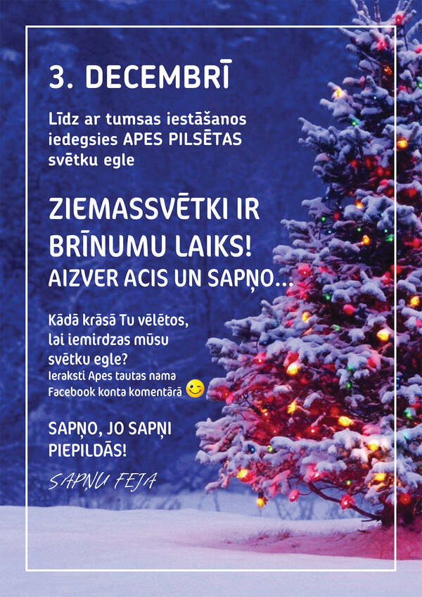3. decembrī līdz ar tumsas iestāšanos iedegsies Apes pilsētas svētku egle!