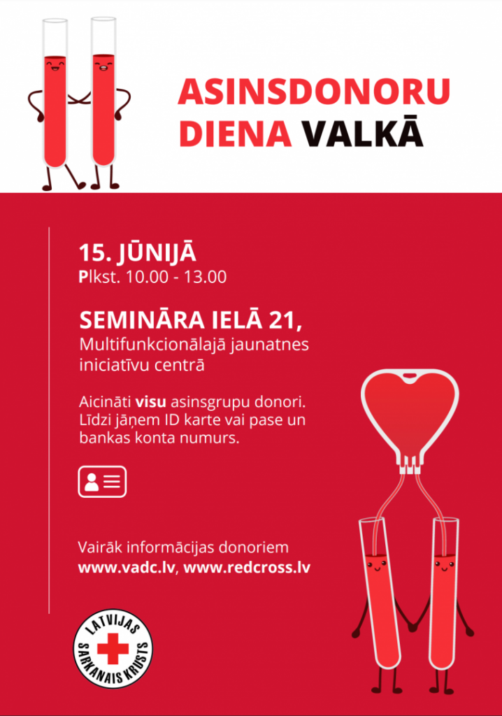 15. jūnijā no plkst. 10.00 līdz 13.00 visu asinsgrupu donori aicināti ziedot asinis Valkā, Semināra ielā 21, “Multifunkcionālajā jaunatnes iniciatīvu centrā”.