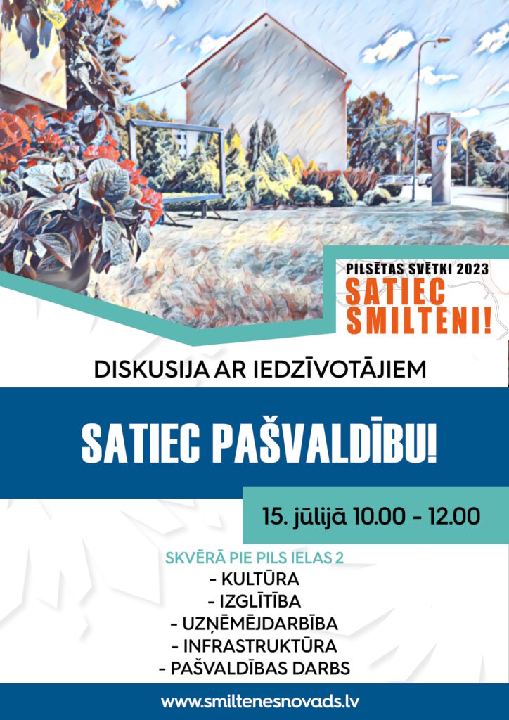 Sestdien, 15. jūlijā, Smiltenes pilsētas svētku ietvaros pašvaldības vadība aicina iedzīvotājus no plkst. 10.00 līdz 12.00 piedalīties atvērtajā diskusijā “Satiec pašvaldību!”, kas notiks skvērā, pie Pils ielas 2. Diskusijas mērķis ir veicināt sabiedrības iesaistīšanu un tās aktīvu līdzdalību novada attīstības procesos.