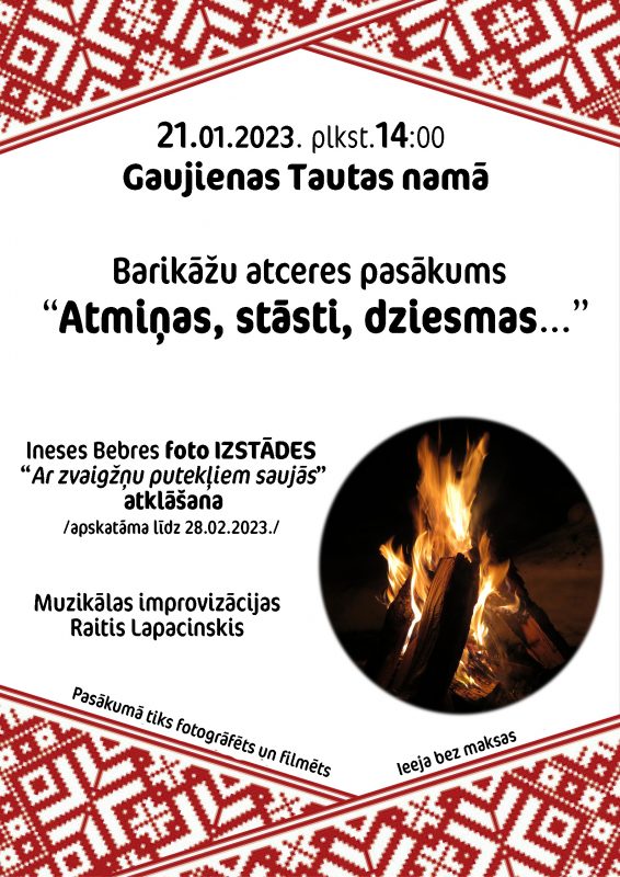 21.janvārī plkst. 14.00  Gaujienas tautas namā notiks Barikāžu atceres pasākumus ‘’Atmiņas, stāsti, dziesmas’’ un Ineses Bebres foto izstādes “Ar zvaigžņu putekļiem saujās” atklāšana, kurā izskanēs muzikālās kompozīcijas, ko izpildīs Raitis Lapacinskis.