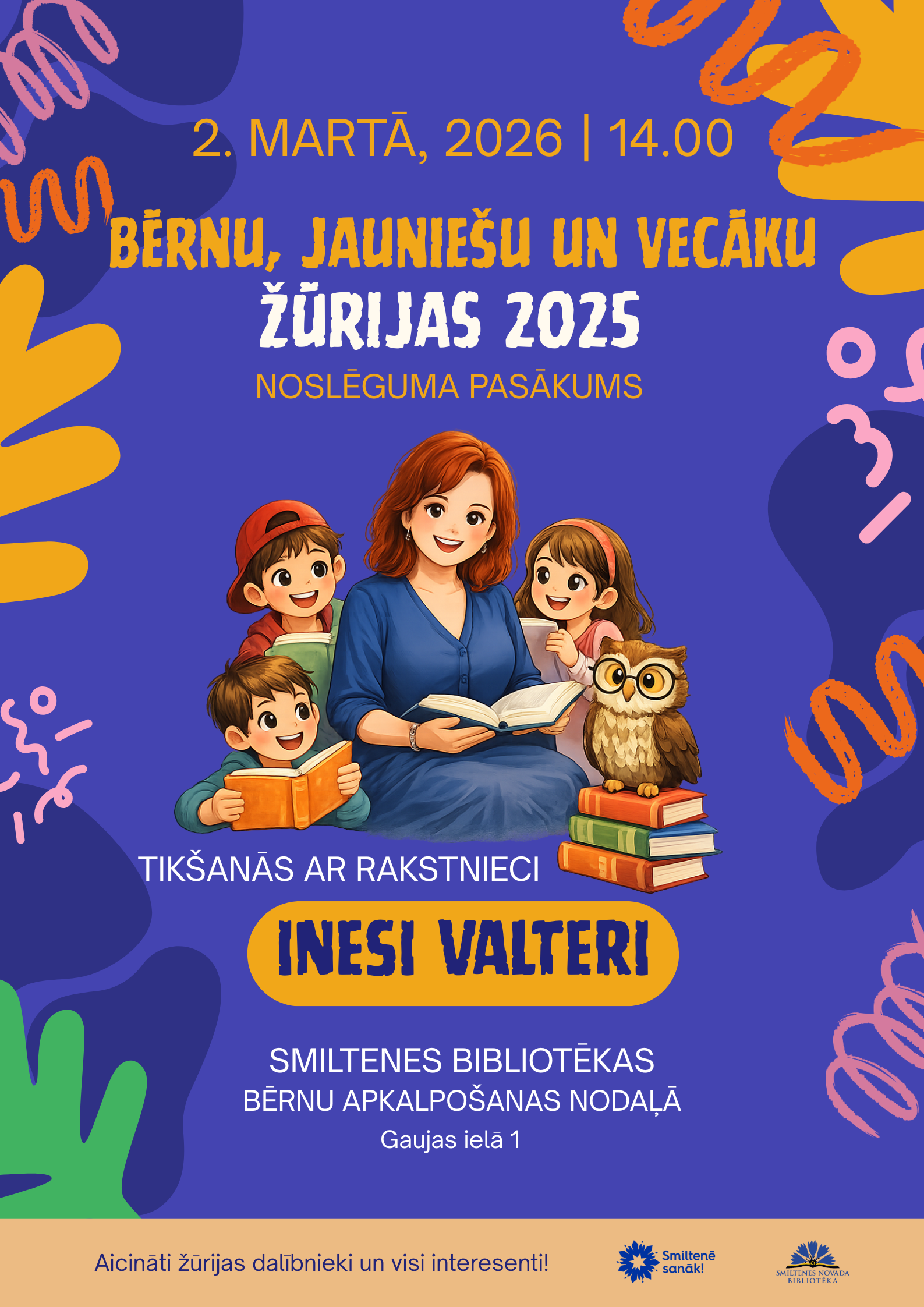 Smiltenes bibliotēkas Bērnu apkalpošanas nodaļa 2. martā plkst. 14.00 aicina uz lasīšanas veicināšanas programmas “Bērnu, jauniešu un vecāku žūrija 2025” noslēguma pasākumu. Tā īpašā viešņa būs bērnu grāmatu autore Inese Valtere.