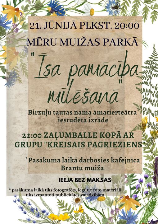 21. jūnijā plkst. 20.00 Mēru muižas parkā aicinām uz Birzuļu tautas nama amatierteātra iestudētu izrādi pēc Rūdolfa Blaumaņa stāsta motīviem “Īsa pamācība mīlēšanā”.