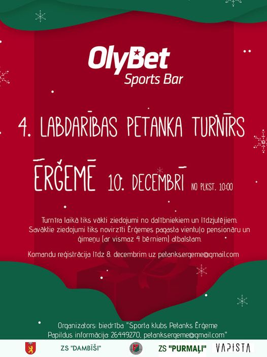 Biedrība “Sporta klubs “Petanks Ērģeme” 10. decembrī Ērģemes petanka sporta centrā (Valkas novads, Ērģemes pagasts) organizē 4. labdarības petanka turnīru trijnieku komandām, kura laikā tiks vākti ziedojumi no dalībniekiem un līdzjutējiem labdarības mērķim. Visi ziedojumi tiks novirzīti Ērģemes pagasta vientuļo pensionāru un ģimeņu (ar vismaz 4 bērniem) atbalstam.