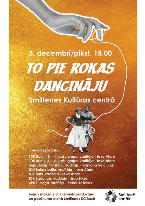 3.decembrī plkst. 18.00 Smiltenes Kultūras centrā notiks deju koncerts “To pie rokas dancināju”. Raitā deju solī vienosies kolektīvi no Smiltenes un Valmieras.