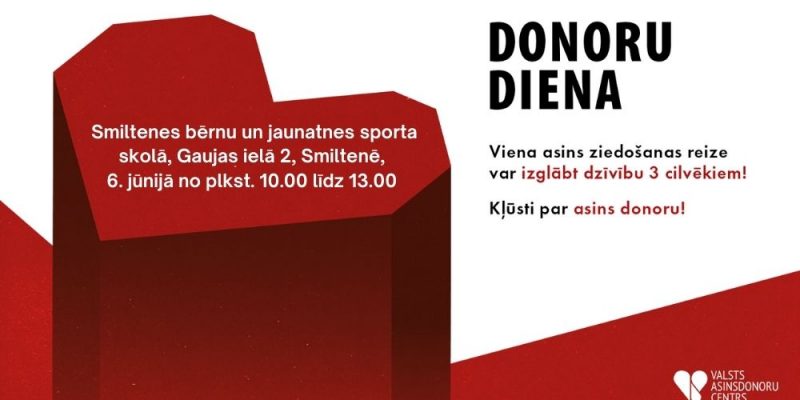 Asins donoru diena plānota Smiltenes Bērnu un jaunatnes sporta skolā, Gaujas ielā 2, Smiltenē, plkst. 10.00 — 13.00.