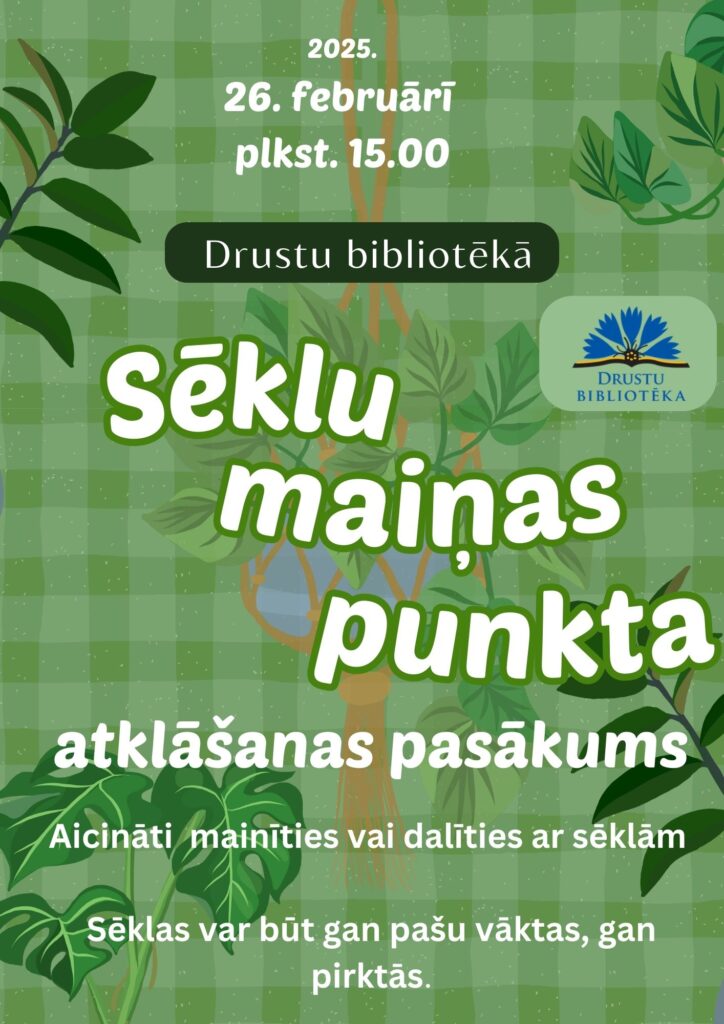 26. februārī plkst. 15.00 interesenti aicināti uz Sēklu maiņas punkta atklāšanas pasākumu Drustu bibliotēkā.
