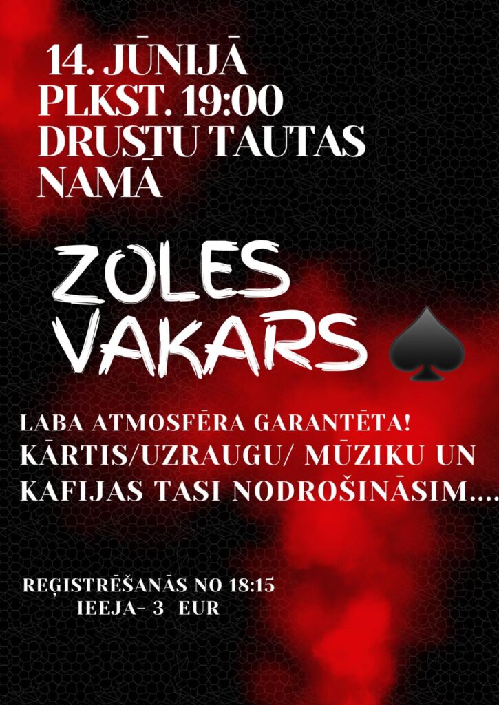 14.jūnijā plkst. 19.00 Drustu Tautas namā zoles vakars. Reģistrēšanās no plkst. 18.15. Ieejas maksa 3.00 EUR.