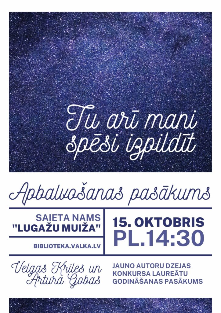 15.oktobrī plkst.14:30 Valkas pagasta Saieta namā “Lugažu muiža” notiks dzejas autoru – iesācēju konkursa “Tu arī mani spēsi izpildīt” laureātu apbalvošanas pasākums. Tā laikā tiks paziņoti un godināti augstāko vērtējumu ieguvušie darbu autori un izskanēs dzeja jauno dzejnieku lasījumā. Par pasākuma muzikālo noformējumu rūpēsies dzejniece un dziesminiece Elīna Līce.