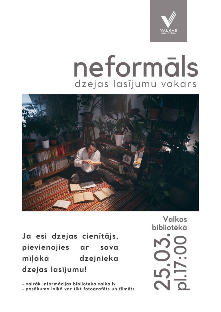 Valkas bibliotēkas Pieaugušo literatūras nodaļa aicina iesaistīties dzejas lasījumu vakarā ”neformāls” 25. martā plkst.17 Valkas bibliotēkas telpās. Ar savu iecienīto dzejoļu lasījumiem piedalīties aicināts ikviens dzejas cienītājs.