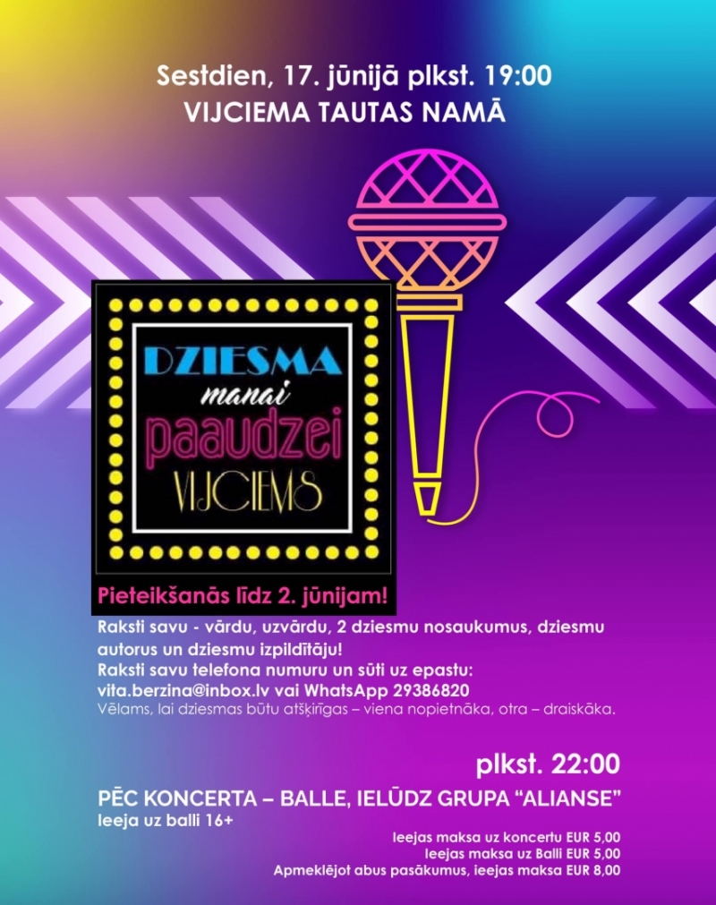 Sestdien, 17. jūnijā plkst. 19.00 Vijciema tautas nams ielūdz uz pasākumu Dziesma manai paaudzei!