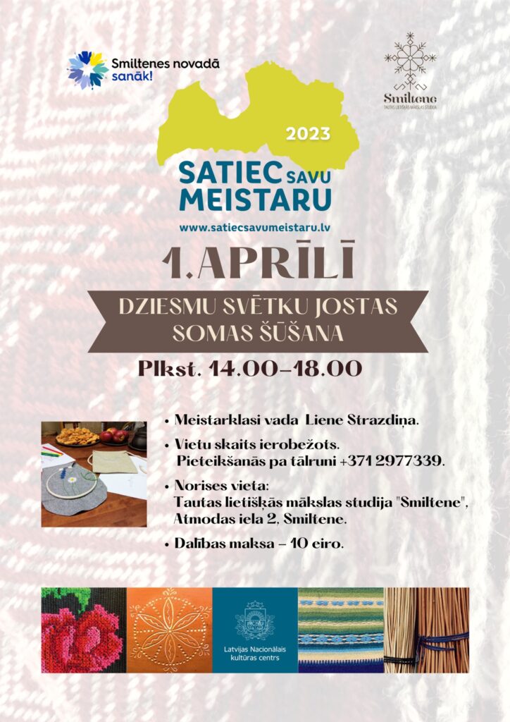 No 31. marta līdz 2. aprīlim visā Latvijā norisināsies pasākums ”Satiec savu meistaru!” Arī Smiltenē, Atmodas ielā 2, TLMS “Smiltene”, 1. aprīlī pl. 14.00 -18.00 būs iespēja satikt savu meistaru un iepazīties ar jostas somu šūšanu.