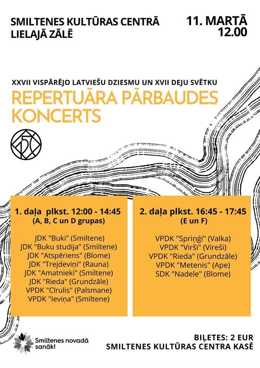 Koncerts plānots divās daļās – pirmā daļa no plkst. 12.00, otrā no plkst. 16.45. Biļetes iepriekšpārdošanā un pasākuma dienā Smiltenes Kultūras centra kasē – 2 EUR