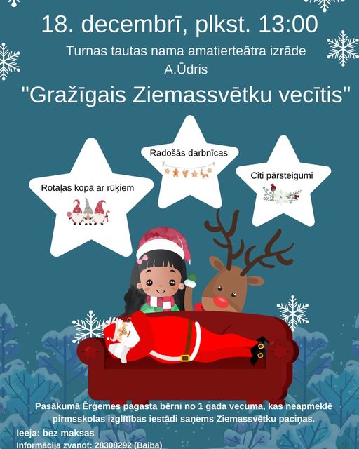 Turnas tautas namā 18.decembrī Ērģemes pagasta aktieru izrāde “Gražīgais Ziemassvētku vecītis”, rotaļas ar rūķiem, radošās darbnīcas un citi pārsteigumi.