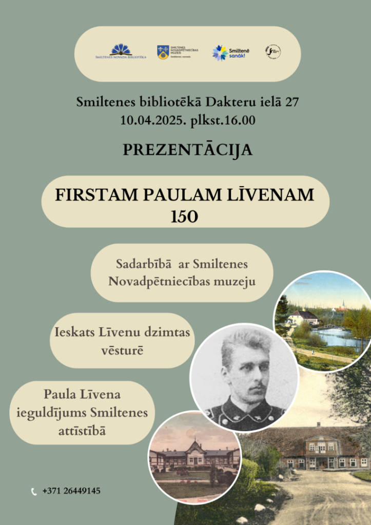Smiltenes bibliotēkā 10.aprīlī notiks firsta Paula Līvena (1875-1963) 150.dzimšanas dienai veltīts pasākums, ko organizē Smiltenes bibliotēka sadarbībā ar Smiltenes Novadpētniecības muzeju. Smiltene šogad atzīmē 105.jubileju, kopš piešķirtas pilsētas tiesības un lepojas ar piešķirto 2025.gada Baltijas jūras reģiona kultūras pērles tituluFirsts Pauls Līvens, ieviešot jaunākos tehnoloģijas sasniegumus, kā arī sadalot muižas zemi gruntsgabalos un iznomājot iedzīvotājiem mūža rentē, veicināja Smiltenes muižas un miesta saimniecisko attīstību un uzplaukumu, kas radīja priekšnoteikumus pilsētas tiesību piešķiršanai Smiltenei 1920.gada 2.janvārī.