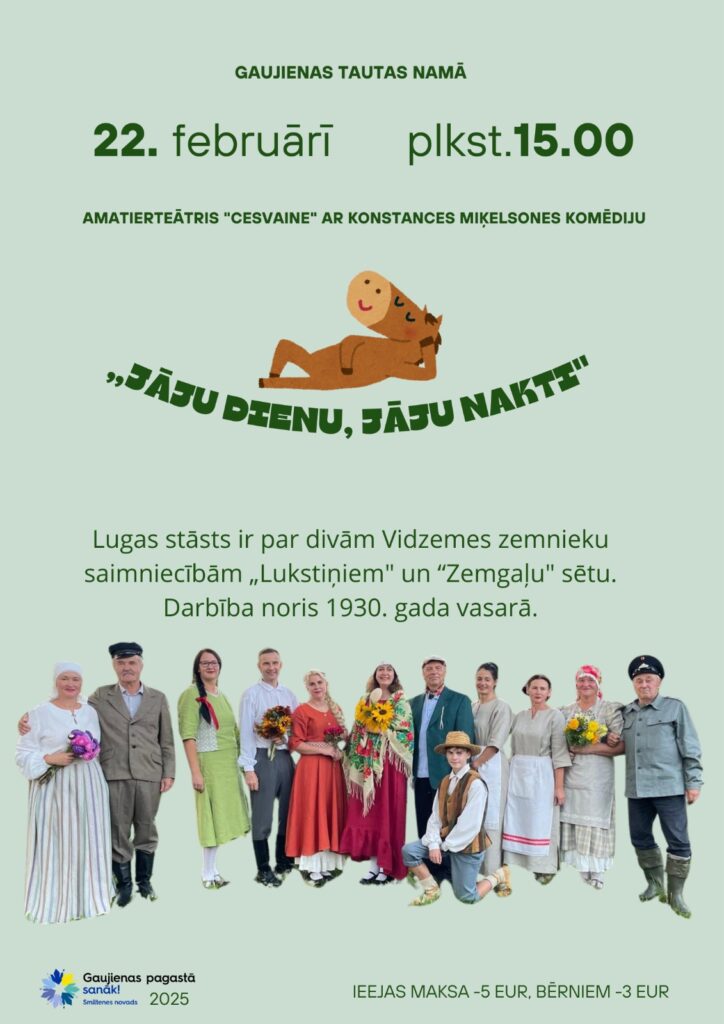 22.februāri 15.00 Gaujienas Tautas namā viesosies Cesvaines amatierteātris ar Konstance Miķelsone komēdiju „Jāju dienu, jāju nakti”.