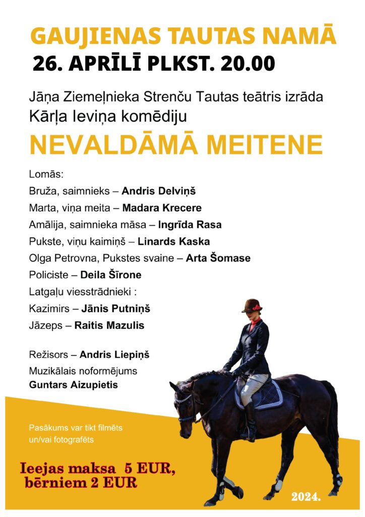 Jāņa Ziemeļnieka Strenču Tautas teātris izrāda Kārļa Ieviņa komēdiju ‘’Nevaldāma meitene’’. Ieeja 5,00 EUR, bērniem 2,00 EUR