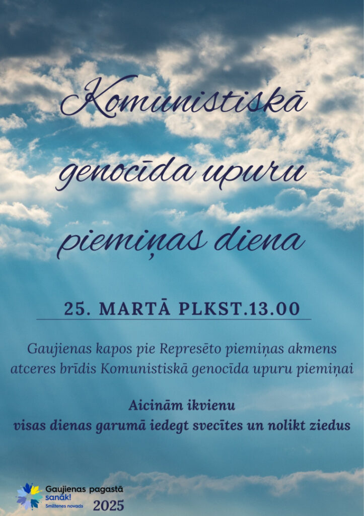 25. martā pulksten.13.00 Gaujienas kapos pie Represēto piemiņas akmens atceres brīdis Komunistiskā genocīda upuru piemiņai. Aicinām ikvienu visas dienas garumā iedegt svecītes un nolikt ziedus.