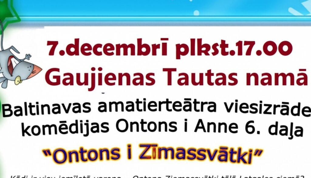 7. decembrī plkst.17.00 Gaujienas Tautas namā viesosies Baltinavas amatierteātris “Palādes’’ ar Danskovītes lugu “Ontans i Zīmasvātki”. Ieejas maksas 7,00 EUR, 3,00 EUR bērniem