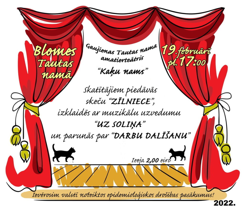 Blomes Tautas namā 19. februārī plkst. 17.00 viesosies Gaujienas Tautas nama amatierteātris “Kaķu nams” ar izklaidējošu programmu.