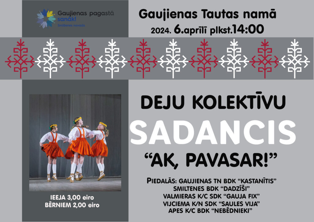 Deju kolektīvu sadancis “Ak, pavasar!’’ Aicina Gaujienas t/n BDK ’’Kastanītis’’. Piedalās vieskolektīvi no Smiltenes BDK ’’Dadzīši’’, Valmieras k/c SDK “GAUJA FIX”, Vijciema k/n SDK ’’Saules vija’. Ieeja 3,00 EUR, bērniem 2,00 EUR