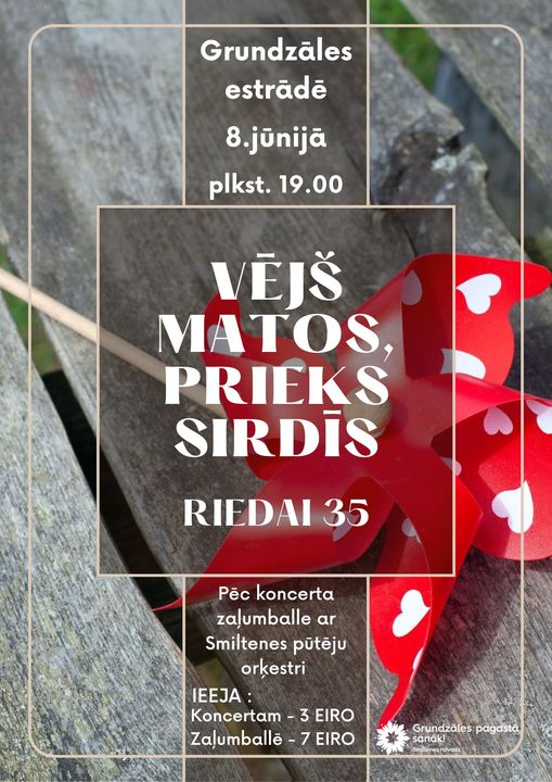 8.jūnijā plkst. 19.00 Grundzāles brīvdabas estrādē Deju kolektīva “Rieda” 35 gadu jubilejas koncerts “Vējš matos, prieks sirdīs!”. Ieejas maksa 3,00 EUR. Plkst. 22.00 Zaļumballe ar Smiltenes Pūtēju orķestri un DJ Demjan. Ieejas maksa 7,00 EUR. Grundzāles Kultūras nams