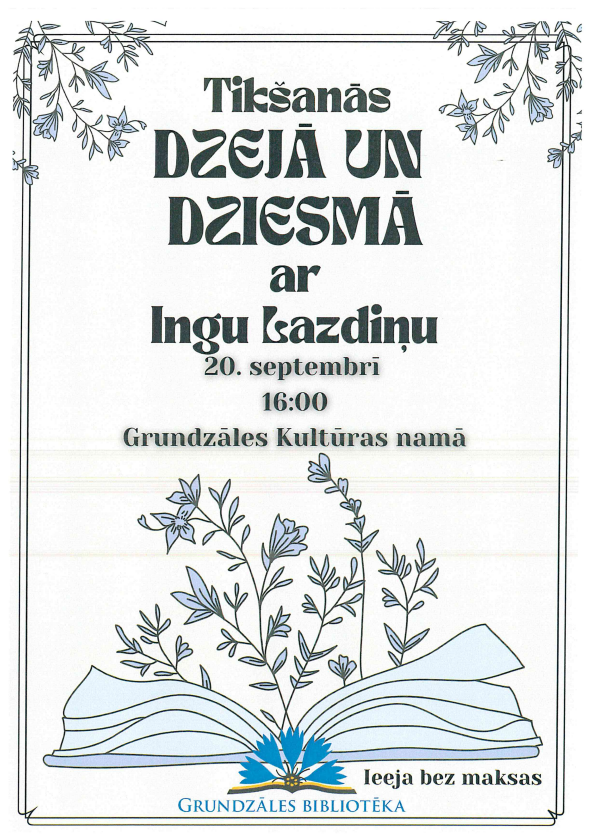 Grundzāles bibliotēka aicina 20. septembrī plkst. 16.00 uz tikšanos “Dzejā un dziesmā” ar Ingu Lazdiņu Grundzāles kultūras namā.