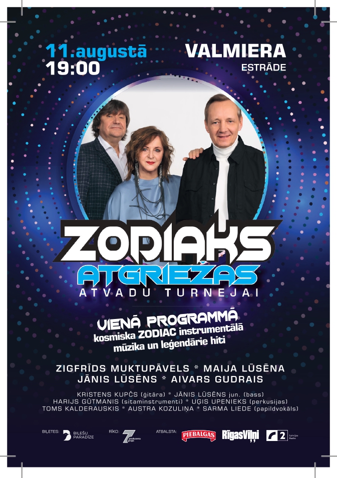 Zodiaka atgriešanās koncerti šovasar notiks 3.jūnijā, Jelgavā, 10.jūnijā Liepājā, koncertdārzā Pūt, vējiņi, 16.jūnijā Siguldas pilsdrupu estrādē, 15.jūlijā Jēkabpilī, Krustpils brīvdabas estrādē, 21.jūlijā Talsos, Sauleskalna estrādē, 22.jūlijā Alūksnes Pilssalas estrādē, 29.jūlijā Saulkrastu brīvdabas estrādē, 11.augustā Valmieras estrādē, 12.augustā Saldū, Kalnsētas parka estrādē, 16.augustā Dzintaru koncertzālē, 19.augustā Bauskas Pilskalna parka estrādē, 26.augustā Ikšķiles brīvdabas estrādē un 16.septembrī Daugavpils kultūras pilī .