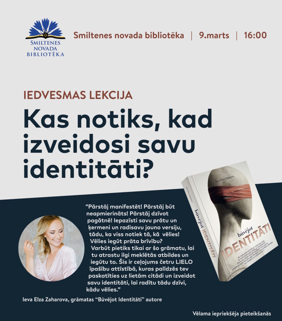 Rakstniece Ieva Elza Zaharova ir sarakstījusi savu pirmo grāmatu “Būvējot identitāti”. Kas tevi vēl attur no savas vislabākās dzīves radīšanas? Kā atgriezties pie sava dabiskā prāta stāvokļa un radīt sev patīkamu dzīvi? Vairāk par grāmatu uzzini mājas lapā www.ievaelzazaharova.com un atnākot uz tikšanos ar autori bibliotēkā.