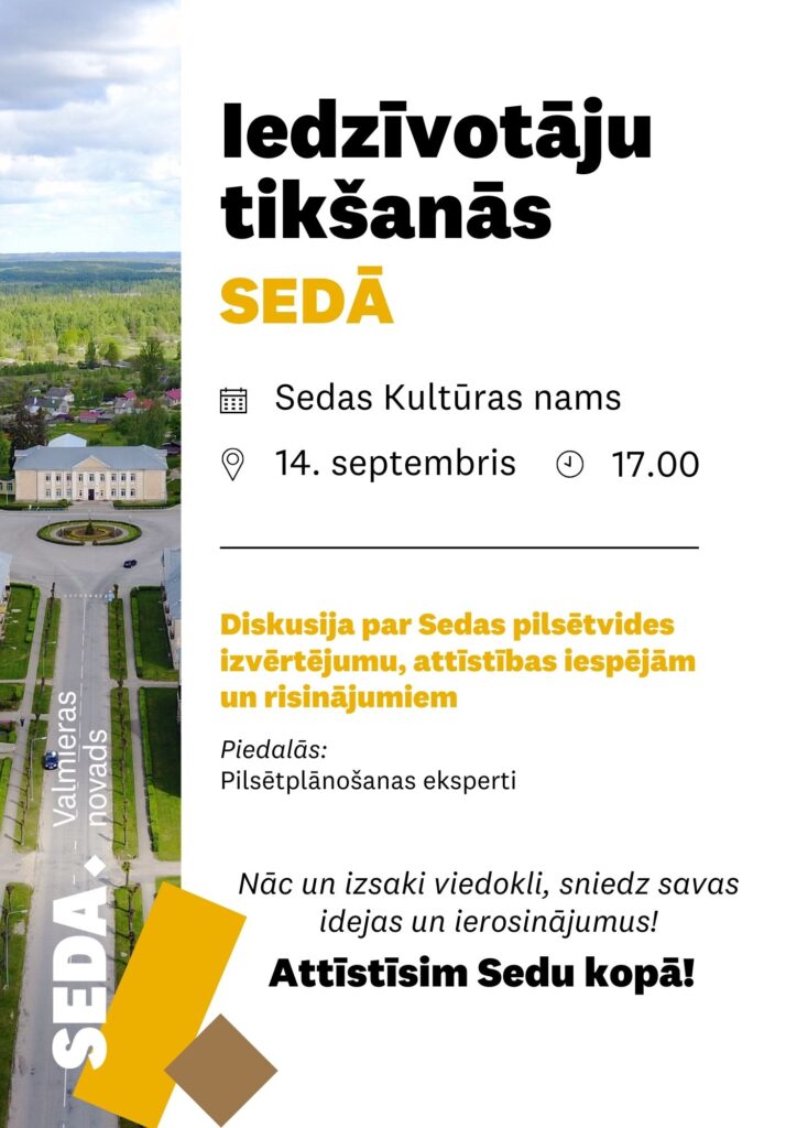 14. septembrī plkst. 17.00 Sedas Kultūras centrā Valmieras novada pašvaldība aicina Sedas esošos, bijušos un jaunos iedzīvotājus uz tikšanos par Sedas pilsētvides esošās situācijas izvērtējumu un diskusiju par attīstības iespējām un iecerēm.