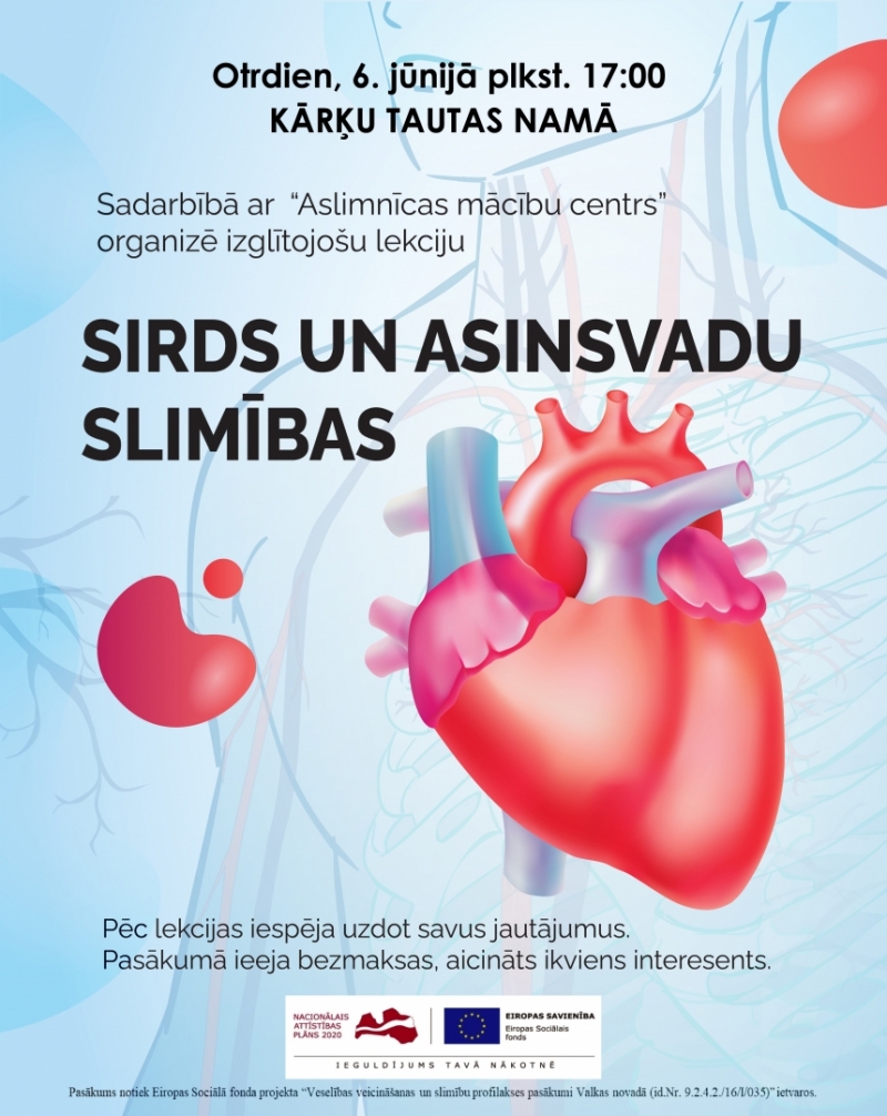 6.jūnijā plkst. 17.00 Kārķu Tautas namā aicinām ikvienu interesentu uz bezmaksas izglītojošu lekciju “Sirds un asinsvadu slimības”.