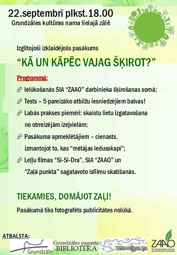 Grundzāles kultūras nama lielajā zālē 22.septembrī plkst. 18.00 notiks izglītojoši izklaidējošs pasākums “Kā un kāpēc vajag šķirot?”.