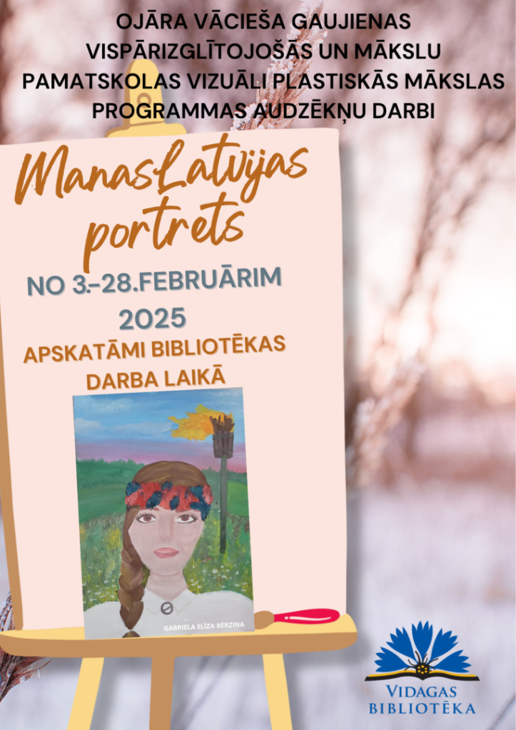 Vidagas bibliotēkā no 3.februāra līdz 28.februārim apskatāma Ojāra Vācieša Gaujienas vispārizglītojošās un mākslu pamatskolas vizuāli plastiskās mākslas nodaļas audzēkņu darbu izstāde “Manas Latvijas portrets”.