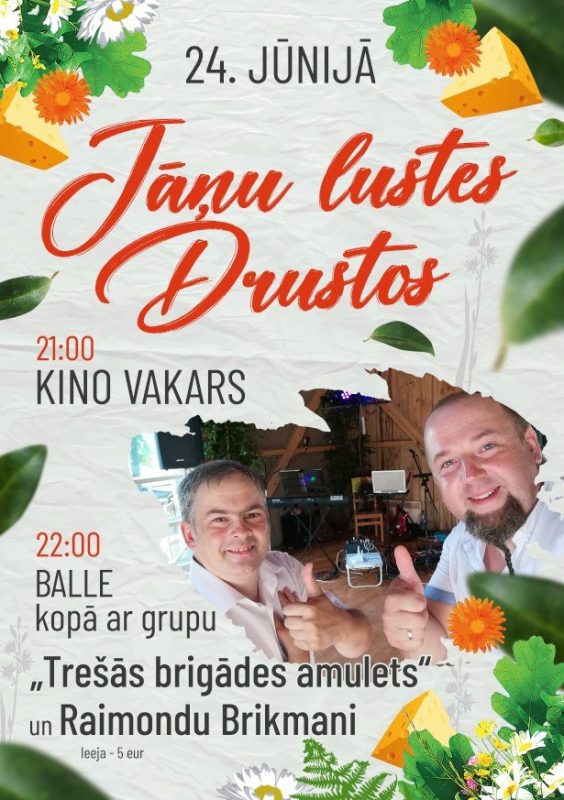 24. jūnijā Jāņu lustes Drustu estrādē – plkst. 21.00 kino vakars, plkst. 22.00 balle kopā ar grupu ,,Trešās brigādes Amulets” un Raimondu Brikmani