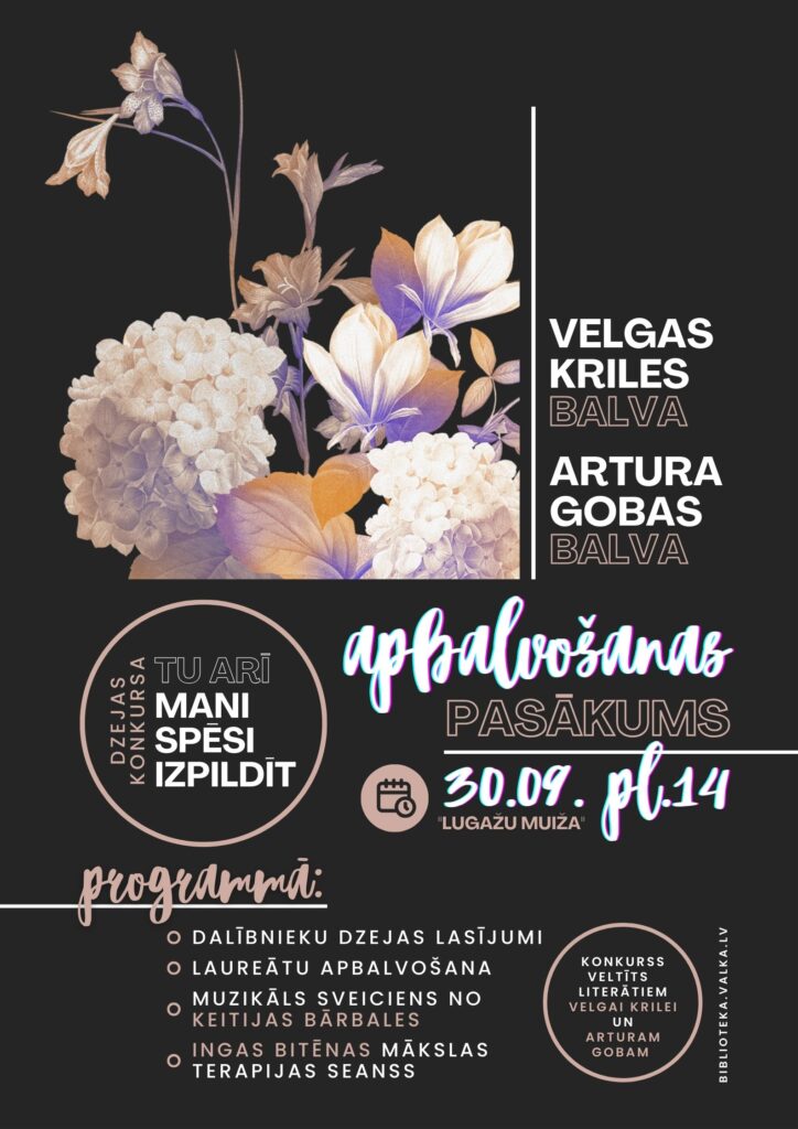 Svinīgā pasākumā tiks paziņoti dzejas autoru-iesācēju konkursa “Tu arī mani spēsi izpildīt” laureāti! Ikviens interesents aicināts 30. septembrī plkst.14 Valkas pagasta Saieta namā “Lugažu muiža”, lai atbalstītu jaunos dzejniekus un iepazītu viņu daiļradi svinīgajā apbalvošanas pasākumā.