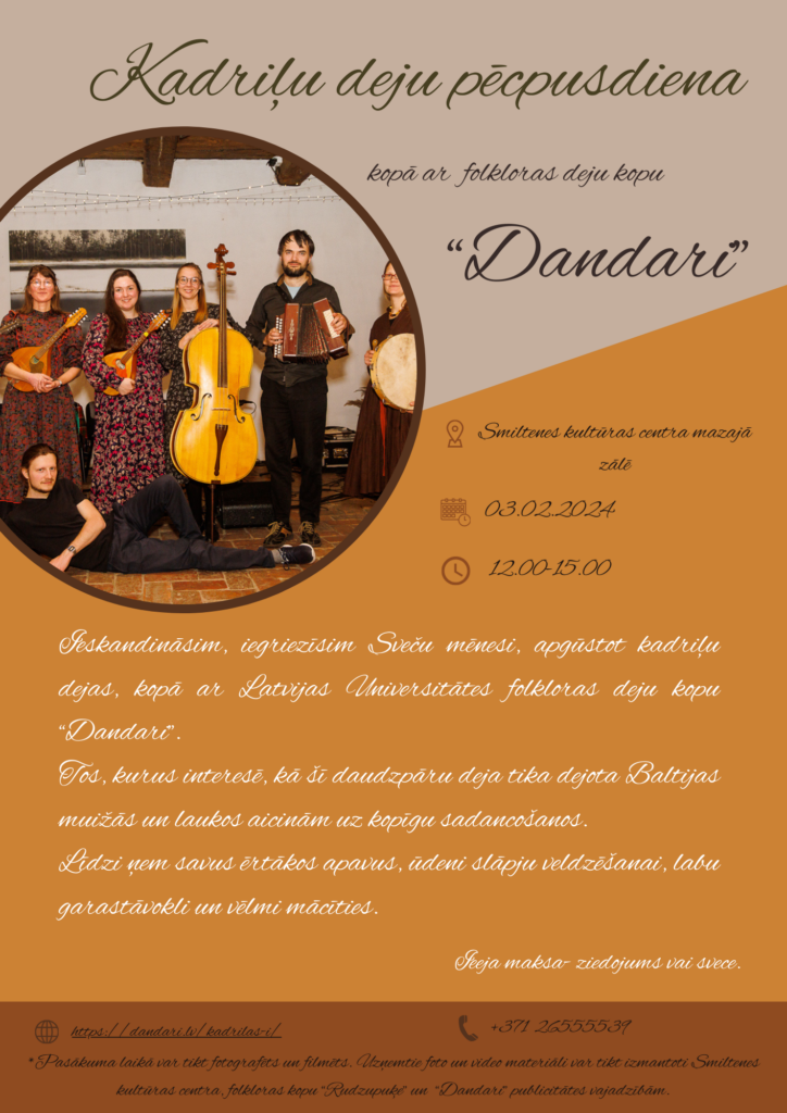 Tāpēc Smiltenes kultūras centrā viesosies, Latvijas Universitātes folkloras deju kopa “Dandari”*, lai plašākam dejotāju pulkam nodotu ilgajā darbības laikā izpētītās un speciālistu interpretētās kadriļas un citas latviešu etnogrāfiskās četrpāru un grupu dejas.