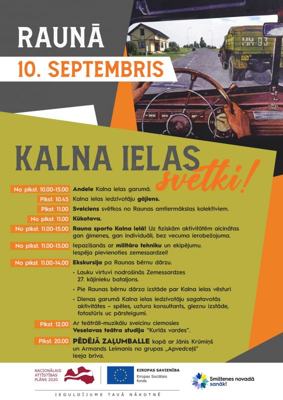 Rauna sporto Kalna ielā! Būs iespēja sportot gan individuāli, gan kopā ar ģimeni. Ar skečiem no dažādām teātra izrādēm un muzikāliem priekšnesumiem ciemosies Veselavas teātra studija ,,Kurlās vardes”. Būs iespēja doties ekskursijā pa Raunas bērnu dārzu. Pie Raunas bērnu dārza būs skatāma izstāde par Kalna ielas vēsturi un notikumiem.