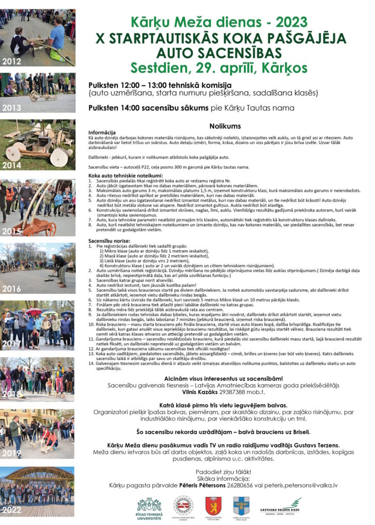 Aicinām jau brīvos brīžos gatavoties pasākumam – gatavot koka auto. To visu var darīt individuāli, vai arī kopā ar draugiem un ģimeni. Lai labāk varētu sagatavoties sacensībām, aicinām iepazītie ar koka auto sacensību nolikumu https://www.facebook.com/karkupagasts/ vai Valkas novada mājas lapā www.valka.lv.