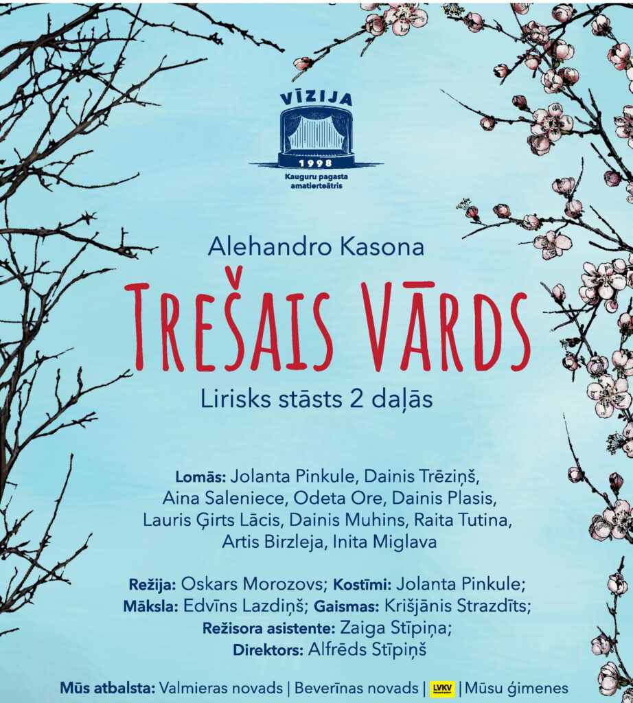 Alehandro Kasonas luga “Trešais vārds” Kauguru pagasta amatierteātra “Vīzija” iestudējumā ir lirisks stāsts par īstām, cilvēciskām jūtām – skumjām, alkām, sāpēm, viltu, dusmām, prieku, vilšanos, un pašu galveno – to, kas sirdīm liek pukstēt straujāk, kas maina cilvēkus un pasauli.