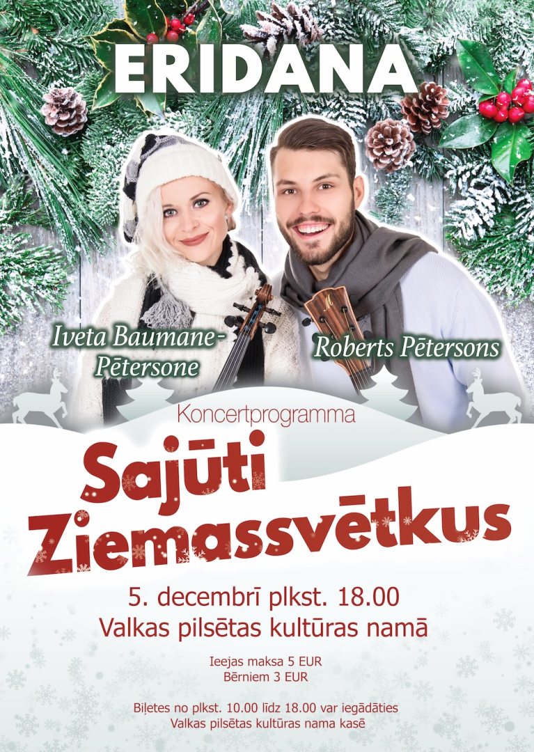 Piektdien, 5. decembrī, plkst. 18.00 Valkas pilsētas kultūras namā (E. Dārziņa ielā 8, Valka) ar koncertprogrammu “Sajūti Ziemassvētkus” viesosies grupa ‘Eridana” – mūziķi Iveta Baumane- Pētersone un Roberts Pētersons.